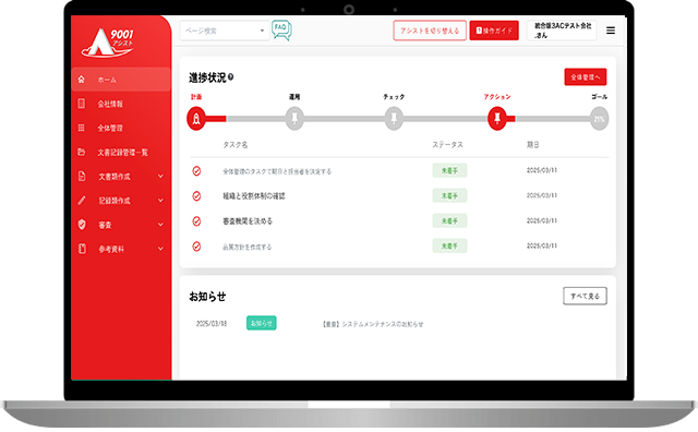 9001アシスト®は、ISO・Pマーク支援のリーディングカンパニー「スリーエーコンサルティング」が開発したクラウド型ISO管理ツールです。創業以来23年間、累計8,000社以上の支援を通じて、ISO運用に関する様々なニーズ・お悩みを解決してきたノウハウが凝縮されています。※ 2025 年 5 月期_P マーク、ISO クラウド型管理ツールにおける市場調査